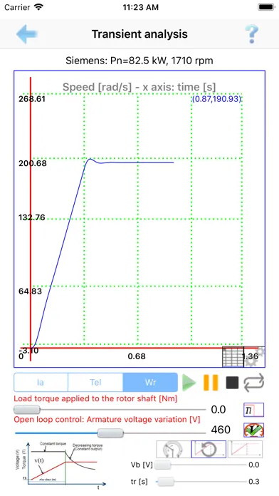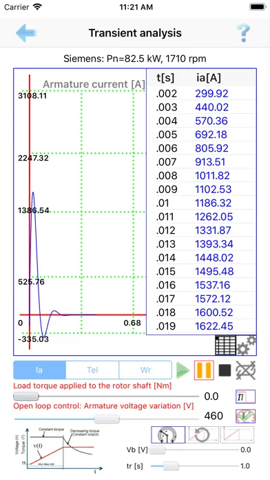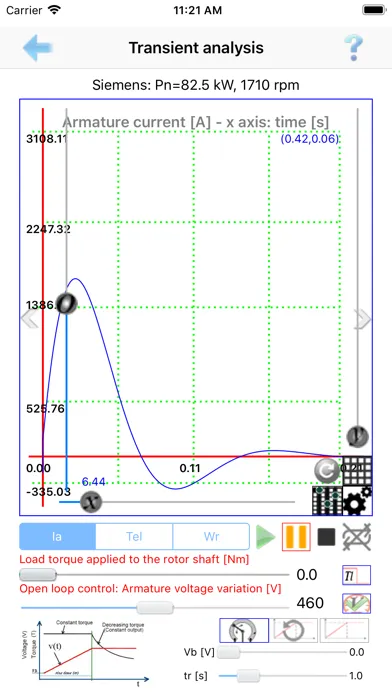 At least the third tab is useful to perform the transient analysis. In particular are analyzed the transient of the Armature current and the Electromagnetic torque and Motor Shaft speed in function of the time. Also in this case the electrical and/or mechanical quantities are plotted, in particular during the transient analysis it is possible to change the Load torque applied to the motor shaft. In the Pro version of the app it is possible to see also numerical values of the graphed quantities, by touching the bottom left area of the graph window, when the simulation is in pause state. In order to perform a more accurate transient analysis it is possible to vary, during the simulation, the following electrical quantities: armature voltage, and excitation winding voltage respectively. Furthermore it is possible to study transient phenomena also varying the armature resistance, by adding an external power resistor in series with the armature circuit.