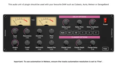This is an AUv3 compatible audio effect which can be used as plugin with your favourite DAW such as Cubasis, Meteor, Auria, AUM or GarageBand. It supports a modern graphical interface and presets with stereo meters for monitoring signal levels.