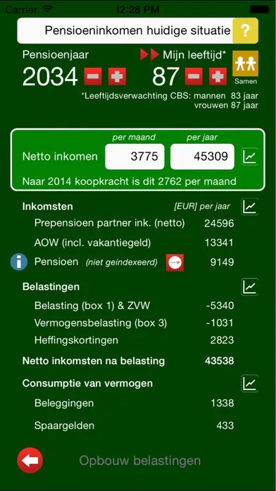 ▸ U krijgt, grafiek ondersteund, een beeld van uw pensioen over alle jaren van uw pensioen (inkomsten, gebruik tegoeden, belastingen, vermogensverloop).