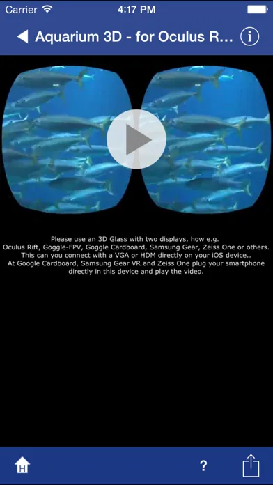 With this App you can view HD 3D Stereo Videos and use a VR Glass with two displays use or your Smartphone with a non display VR Glass.