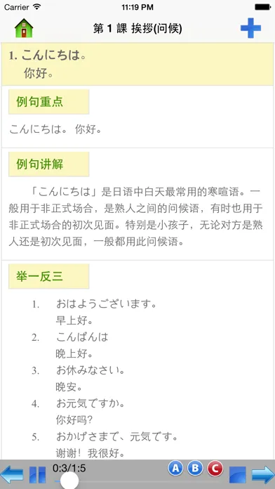 日语300句内容丰富生动、实用性强, 从语言、文化、思维模式三个层面向读者提供了极有价值的信息, 能迅速提高您的口语水平。熟练并恰当使用这些语句, 将会给人一种成熟、自信的感觉。该应用共有30单元, 每单元有10句组成, 每单元包括一个“起始对话”、“文化常识”和“主干句子”, 单元后面还有一个词汇表。每句话包含“例句重点”、“例句讲解”、“举一反三”三部分组成的。是用户学习日语或练习口语的好帮手。