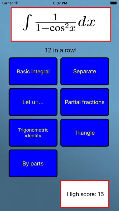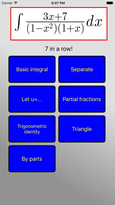 Ever had an integral to solve and been wondering what is the best technique to use? Ever worked on a integral for long minutes, just to figure out you initially chose the wrong path? With this application, you can now concentrate on that critical first step: deciding what method to use! Look at an integral, choose what you would do, try again until you get it right, then go straight to the next integral! If need be, you can stop to look at a partial (sometimes complete) solution highlighting the first few steps of the resolution.