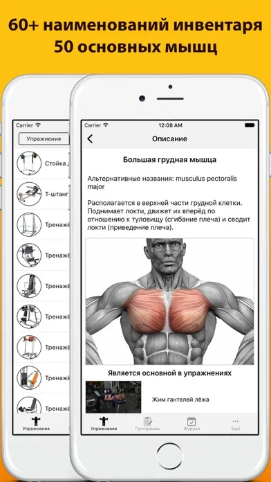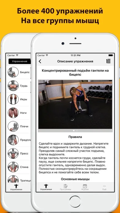 - Более 400 упражнений, которые сопровождаются подробным описанием с фотографиями, указанием задействованных мышц и используемого инвентаря