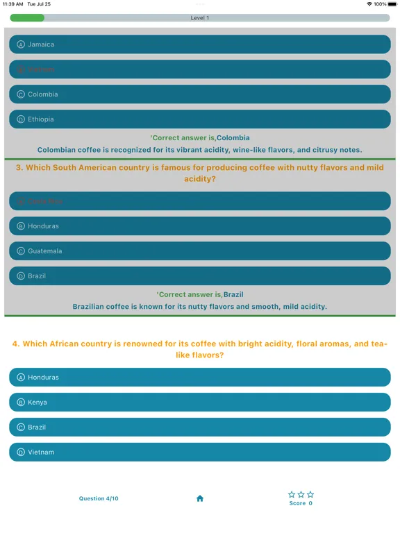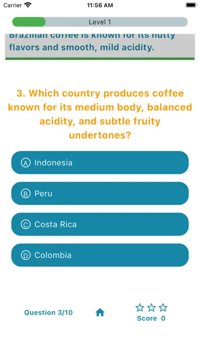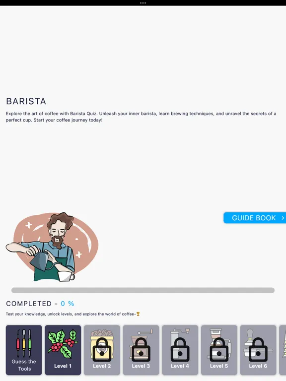 Immerse yourself in a fun and educational journey as you unlock new levels and progress from a coffee enthusiast to a barista expert. With interactive quizzes and detailed answer descriptions, you'll gain practical insights and deepen your understanding of the coffee-making process.