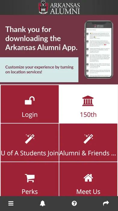 The Arkansas Alumni App connects alumni, friends and fans of the University of Arkansas and brings the power of your Alumni Association membership to your fingertips! Find Arkansas Alumni events near you and receive the latest news from the Hill! Members can also access a mobile membership card, enjoy benefits and discounts on the go, and easily renew your membership from your phone. This FREE app is a must for all Arkansas Alumni, students, fans, friends and members!
