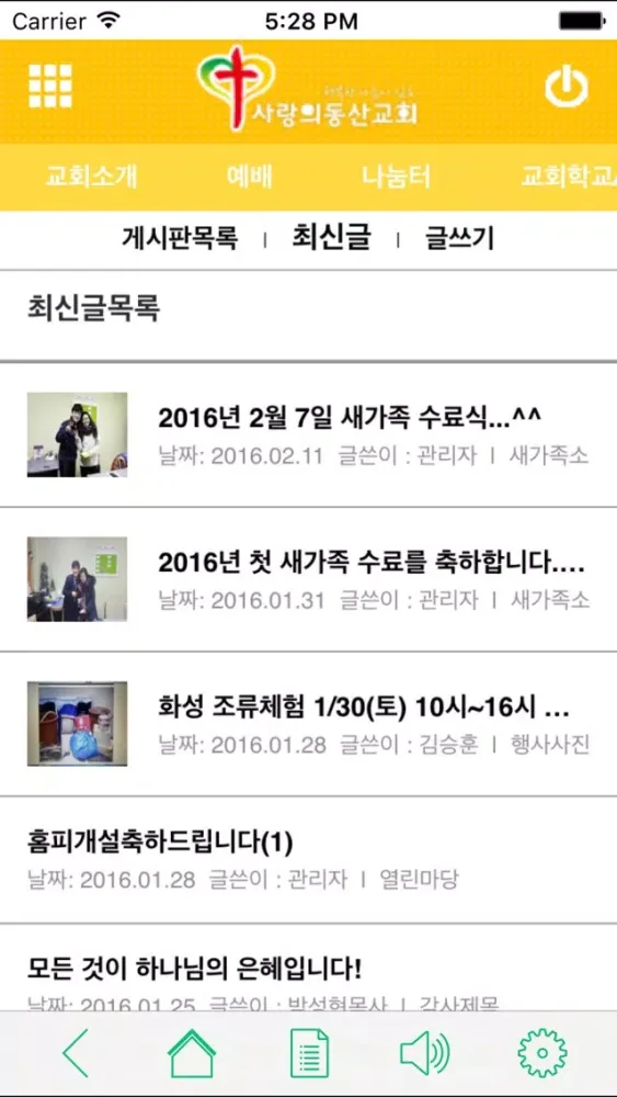 * 게시물, 사진 등록 : 글쓰기가 가능한 게시판과 앨범에서는 앱에서 직접 글등록 및 사진을 찍어서 바로 등록이 가능합니다.