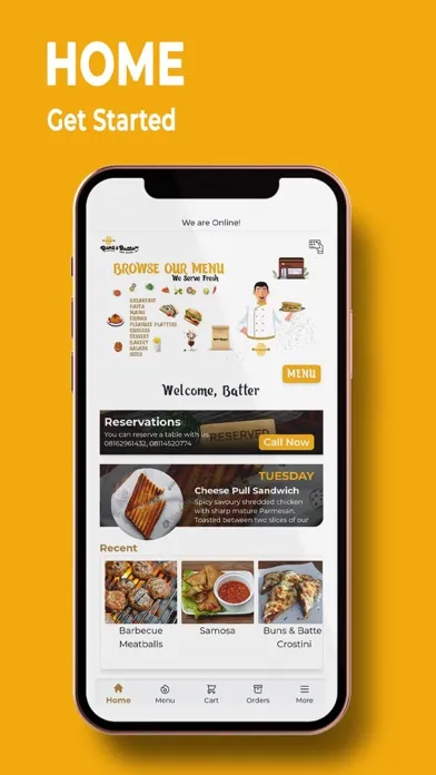 * The HOME page will show you all active promo from Buns and Batter, our Special for the day, and hold your recent searches in case you want to quickly find a menu.