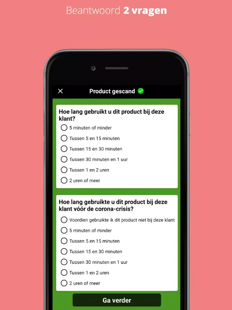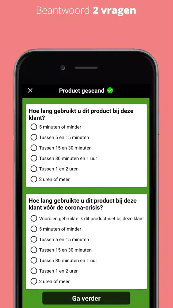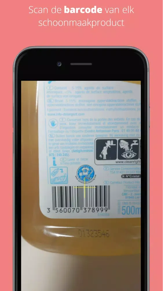 Concreet vragen we u om gedurende 2 weken bij al uw klanten van elk product dat u gebruikt de barcode te scannen met de smartphone app en vervolgens 2 vragen over dit product te beantwoorden. We vragen u om alle producten te scannen: schoonmaakproducten maar ook ontsmettingsmiddelen, afwasmiddelen, onderhoudsproducten, enz. Met de app kan u ook producten invoeren die geen barcode hebben, bijvoorbeeld zelfgemaakte middelen.