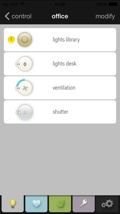 All assigned/programmed actions are listed per location. Shuffle them around to prioritise your locations and actions. Change names or select a different symbol from the library. Remotely control your (dimmed) lights, ventilation, roll-down shutters, sun blinds or thermostat. Instant feedback.