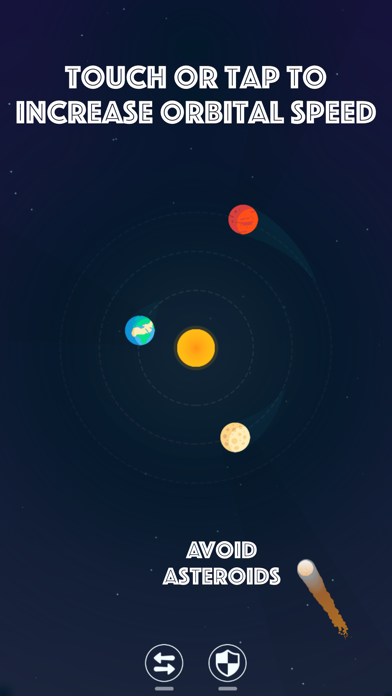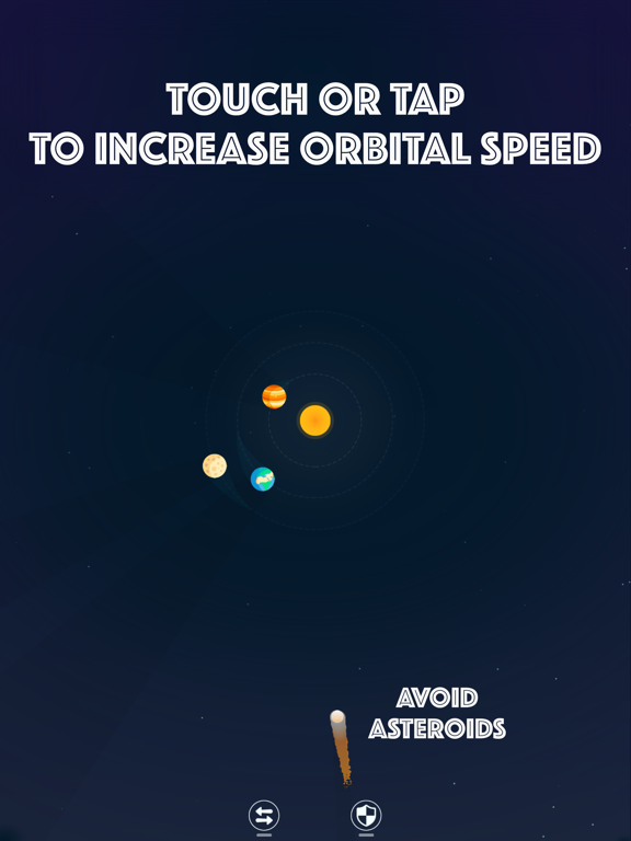 • Simple Controls: touch or tap to increase the speed that your planets orbit the sun, strategically dodging incoming asteroids.