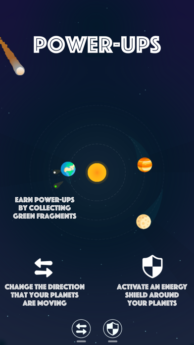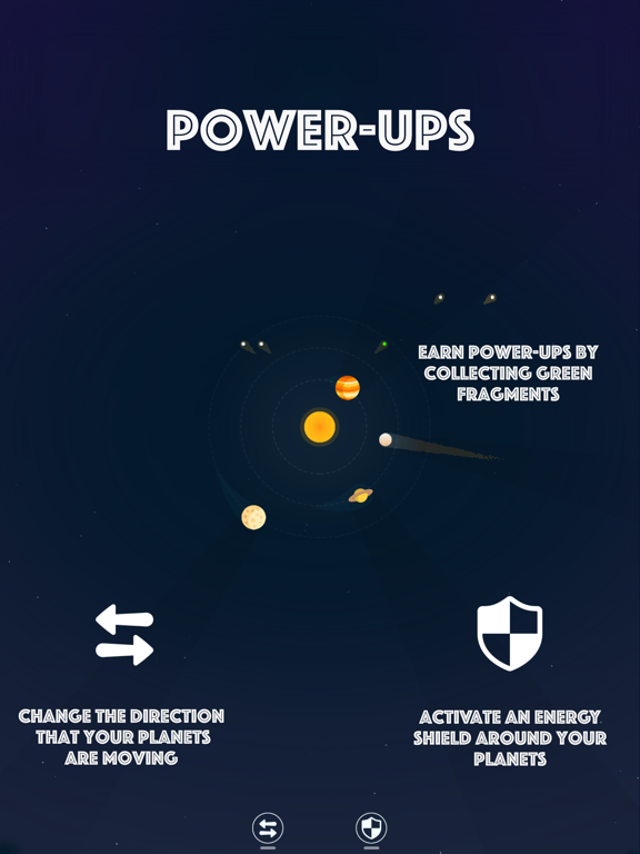 • Earn Power-ups: collecting green fragments will give you the ability to use power-ups. These include an energy shield & the option to switch orbital direction.