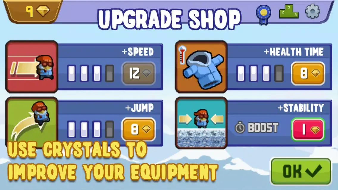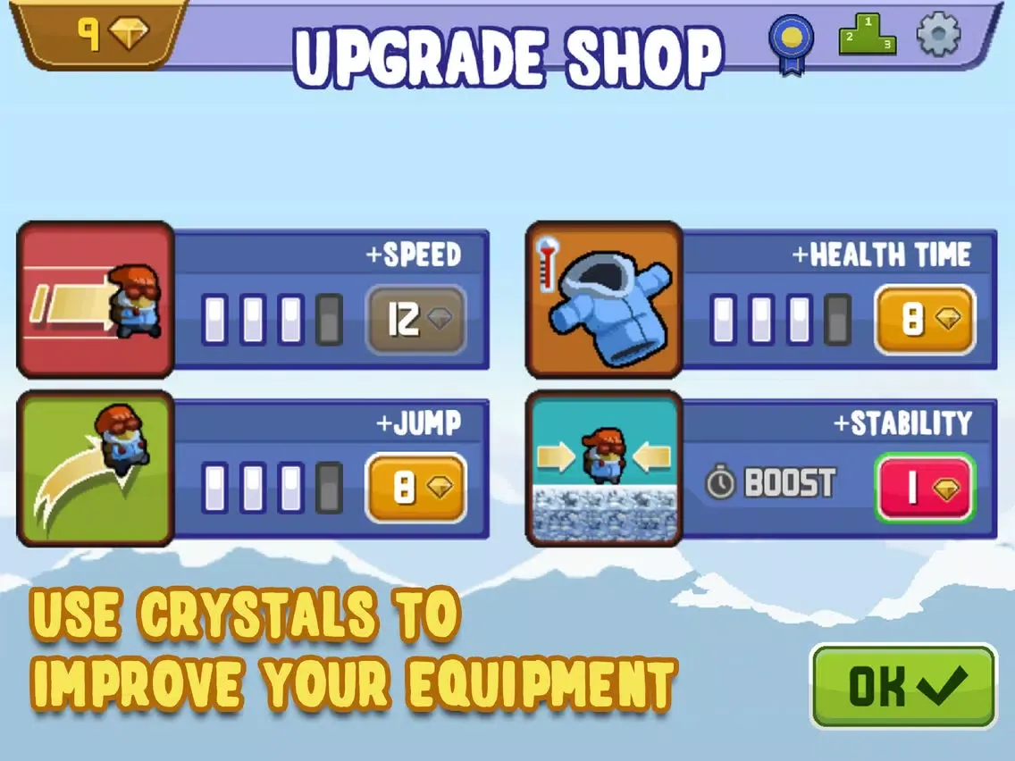 • Collect crystals to improve their equipment and get faster to the mountaintop