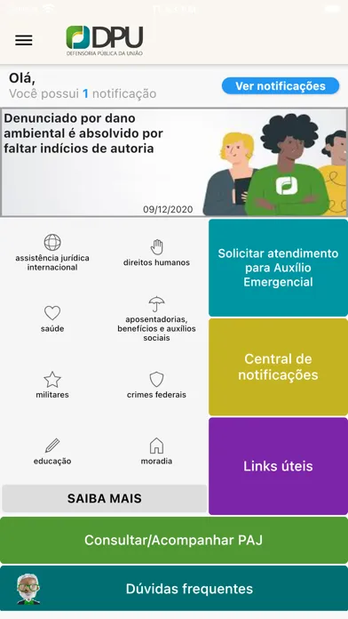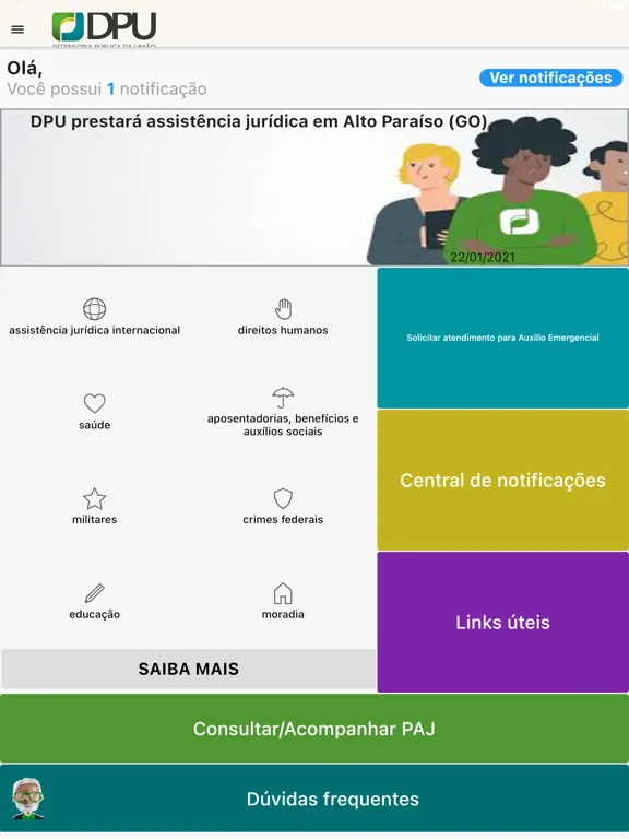 Aplicativo da Defensoria Pública da União (DPU) destinado às pessoas que queiram acompanhar um ou mais processos de assistência jurídica (PAJ's). O próprio assistido, ou até uma pessoa que tenham em mãos os dados do processo, poderá realizar o acompanhamento pelo aplicativo, receber e responder solicitações da Defensoria Pública (informações e envio de documentos). É possível, também, solicitar assistência inicial para questionar o indeferimento do auxílio-emergencial. É necessário logar no aplicativo com uma conta Gov.Br, que poderá ser cadastrada no momento do login, através do próprio aplicativo.