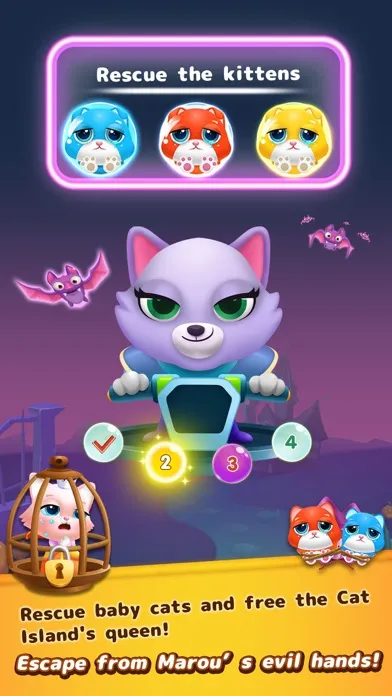 One day, Marou- an evil bubble witch came to the Cat Island. He was extremely jealous of the beauty and happiness of all people here. Therefore, he stole all treasures in the Cat Island, kidnapped Anna's kittens and even captured the queen Sophia. In the dark night, Anna decided to go to rescue her kitten and helped queen Sophia escape from him. In Anna's adventure, she had to face with many challenges and difficulties from the cruel witch to prevent her. Fortunately, our cute cat mom received lots of great help from magic animals new friend like Owl, Elephant and Fox.