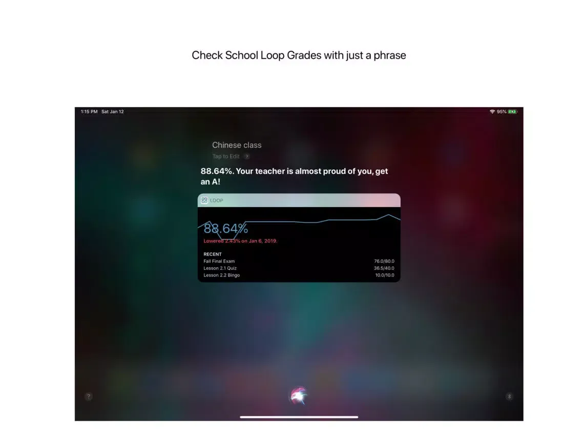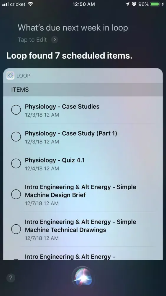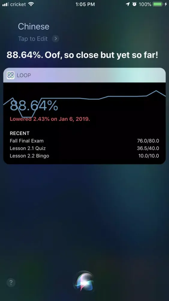 Loop makes your School Loop grades/assignments/emails accessible through your voice with Siri on iPhone, Apple Watch, and even HomePod (assuming you want your neighbors to hear that B you got).