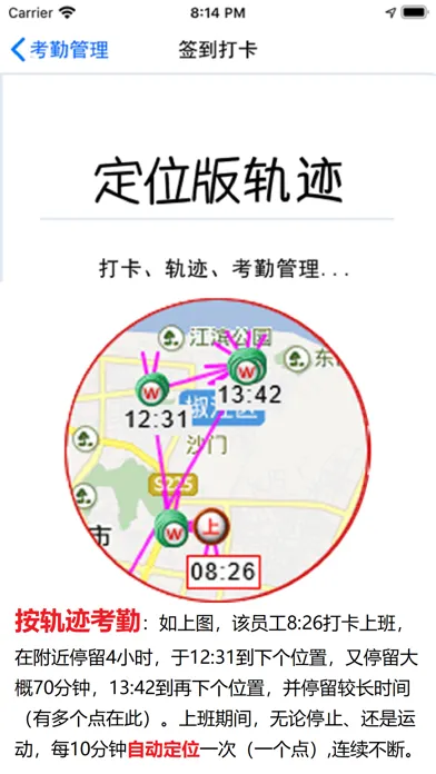 如上图,该员工8:26打卡上班,在附近停留4小时,于12:31到下个位置,又停留大概70分钟,13:42到再下个位置,并停留较长时间(有多个点在此)。上班期间,无论停止、还是运动,每10分钟自动定位一次(一个点),连续不断。真实记录我上班期间的活动轨迹,让领导随时看到我在哪里(明白我一直在工作),实现按轨迹考勤。
