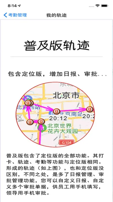 普及版包含了定位版的全部功能。其打卡、轨迹、考勤等功能与定位版相同。形成的轨迹(如上图),也和定位版没区别,不同之处,是多了日报管理、审批管理功能,您可以自定义日报、自定义多个审批单据,供员工用手机填写,领导用手机审批。