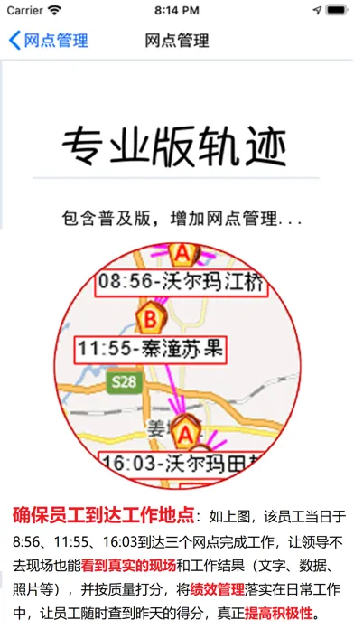 ~网点管理:外勤巡查人员将需要再次到达的位置(包括问题点、客户等等)定位、拍照增加到系统中,以备以后到达后上报现场的情况。