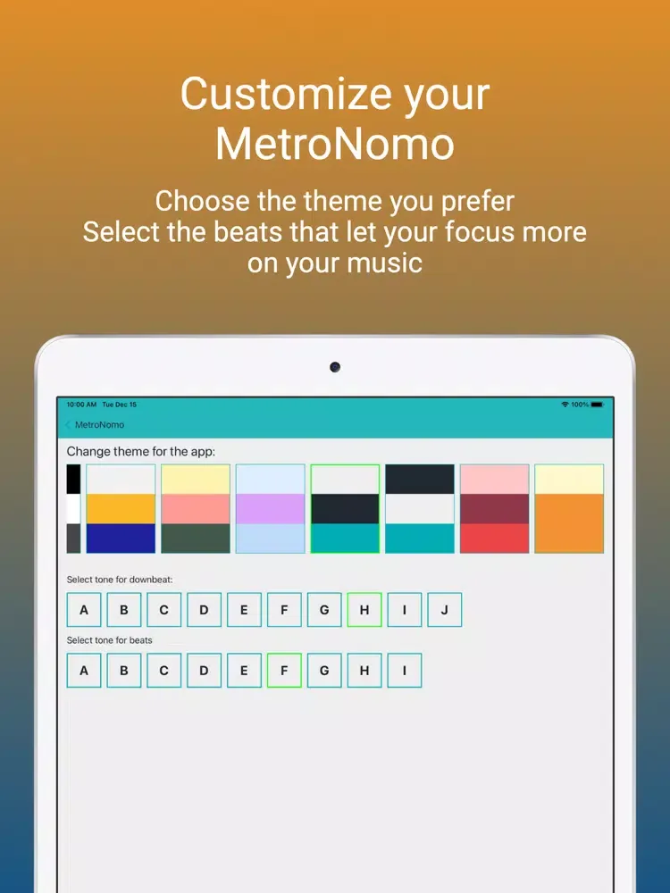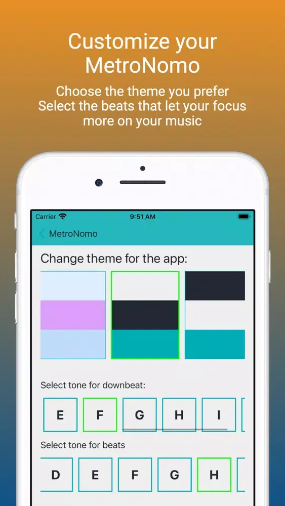 You can fully customize the look and sound of this metronome, by choosing among the tens of different options available, or selecting the colors you prefer yourself!