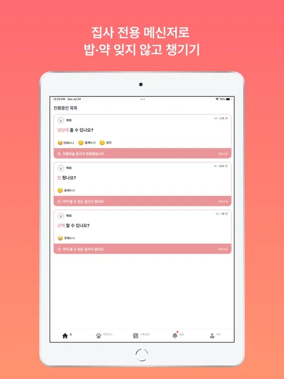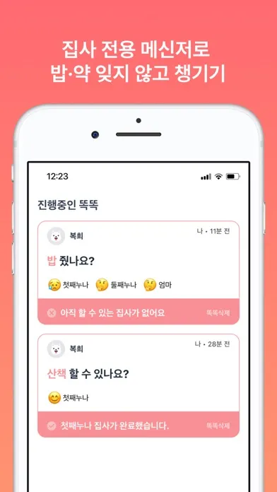 바둑이 밥 줬어요? 아니 안줬어! 매번 메신저 혹은 전화로 불편하게 확인했던 육아 할 일. 똑똑 알림으로 반려동물을 함께 돌보는 가족들과 빠르게 소통해요. 가족들에게 무언가를 해달라고 부탁하고, 실시간으로 누가 수행할 수 있는지 확인해요.