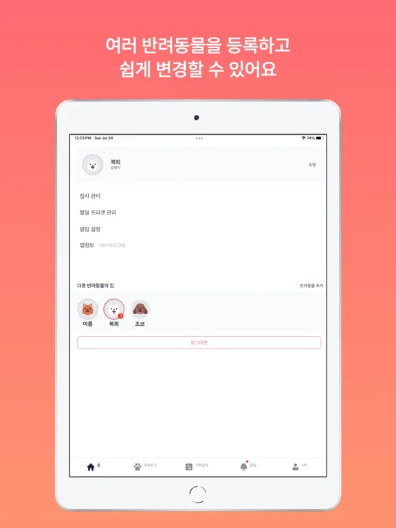 여러 동물 친구들과 함께 사는 집도 각각의 동물 기록을 따로 관리할 수 있어요.
