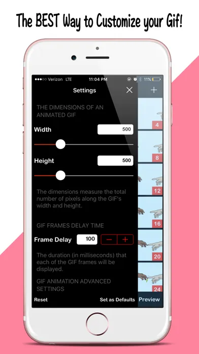 Customization is key! With over 10 different settings, GIFing allows you to make the masterpiece you've been visioning. Change the SIZE of your animation, the frame DELAY, loop count, aspect fit/fill, preserve transparency, CROPPING, and more. All this GIFing power right at your finger tips.