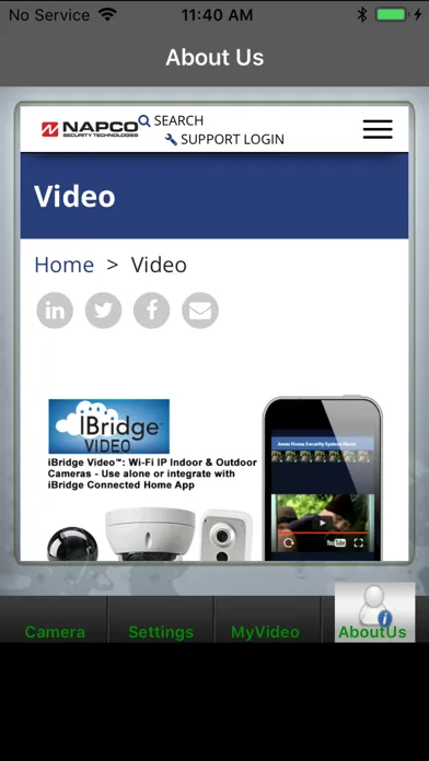 The iSeeVideo application enables the users to watch live video feed on their mobile phones, as captured by their Napco Security Technologies' security camera(s). Pan / Tilt with remote recording commands are also supported.