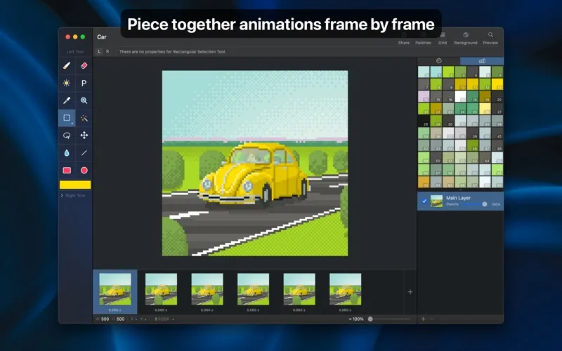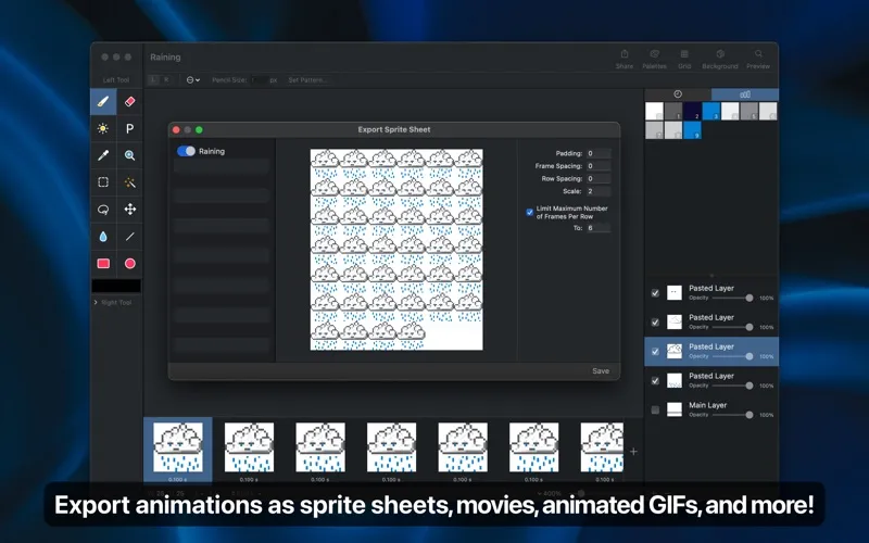 Create and arrange image frames in the filmstrip view to piece together animations. Pixen can import animations from animated GIFs, animated PNGs, and even sprite sheets! It can also export animations as animated GIFs, animated PNGs, movies, and sprite sheets.