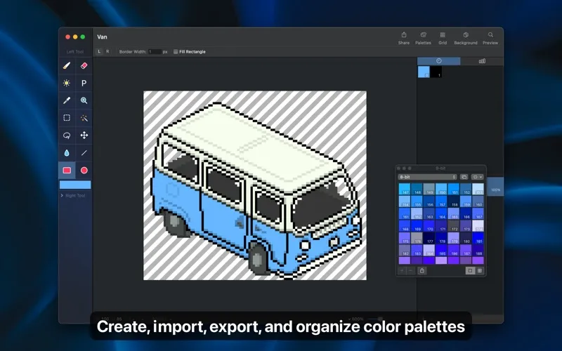 With Pixen, you can add and organize commonly-used colors into palettes. Pixen can also import and export color palettes in the Adobe Color Table, Microsoft Palette, JASC Palette, and GIMP Palette formats. You can even perform palette operations such as sorting colors, removing duplicate colors, and more, directly in the app.