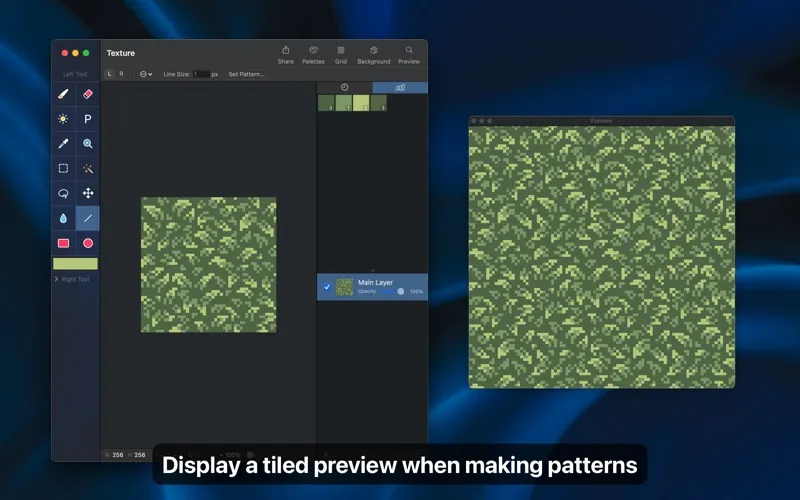 Define custom patterns to use while drawing with the Pencil, Line, or Eraser tool (instead of a single pixel). You can even import patterns from 1-bit images.