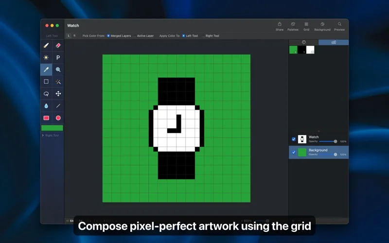 Take advantage of Pixen's grid tools to guide you in placing pixels just where you want them.