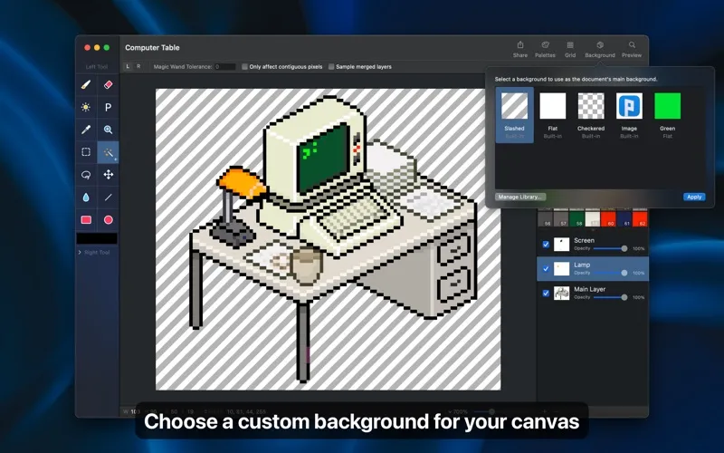 Pick a flat, striped, or checkered background to be drawn beneath the canvas. You can even set a reference image as a background.