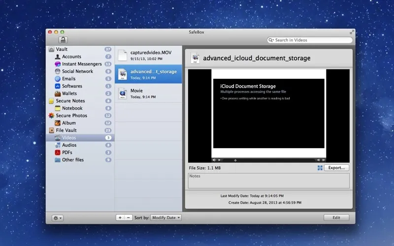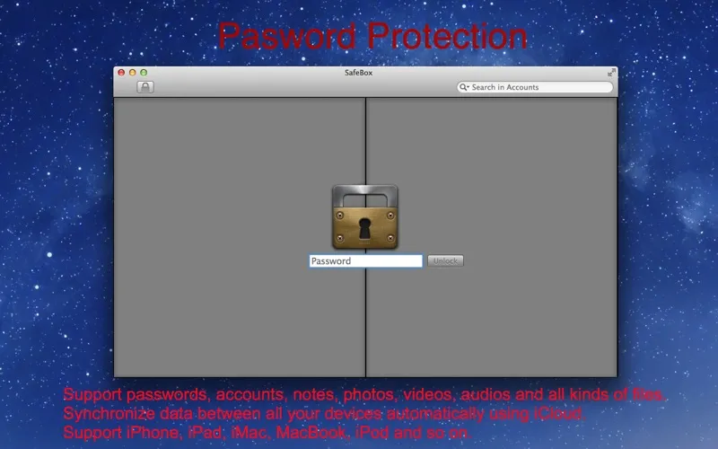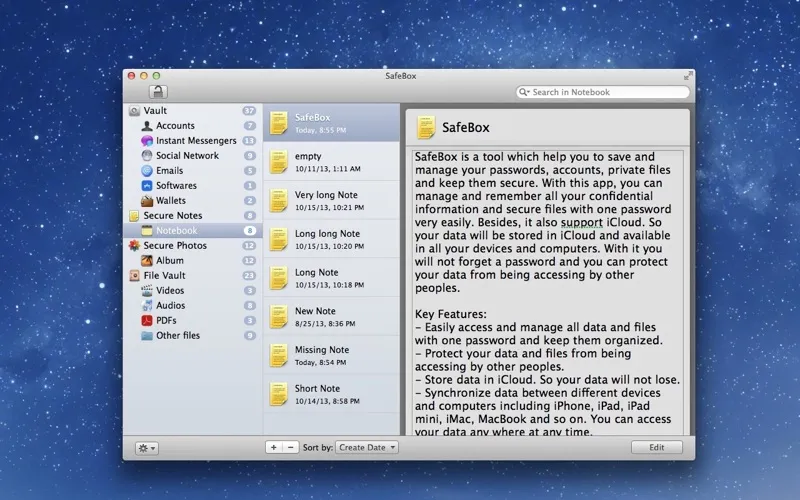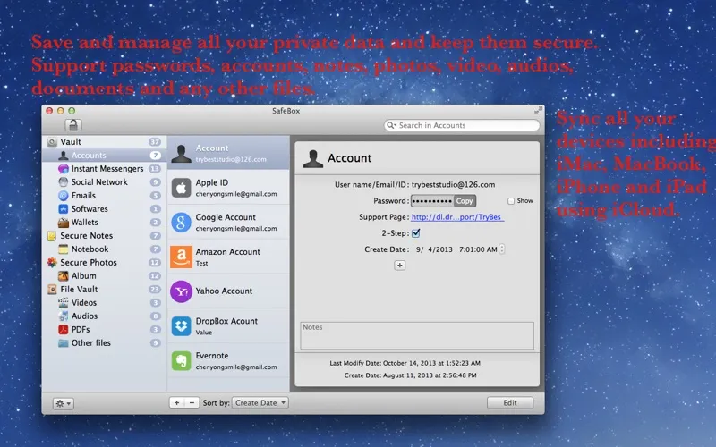 Super SafeBox is a tool which help you to save and manage your passwords, accounts, private files and keep them secure. With this app, you can manage and remember all your confidential information and secure files with one password very easily. Besides, it also supports iCloud. So your data will be stored in iCloud and available in all your devices and computers. With it you will not forget any password and you can protect your data from being accessing by other peoples.