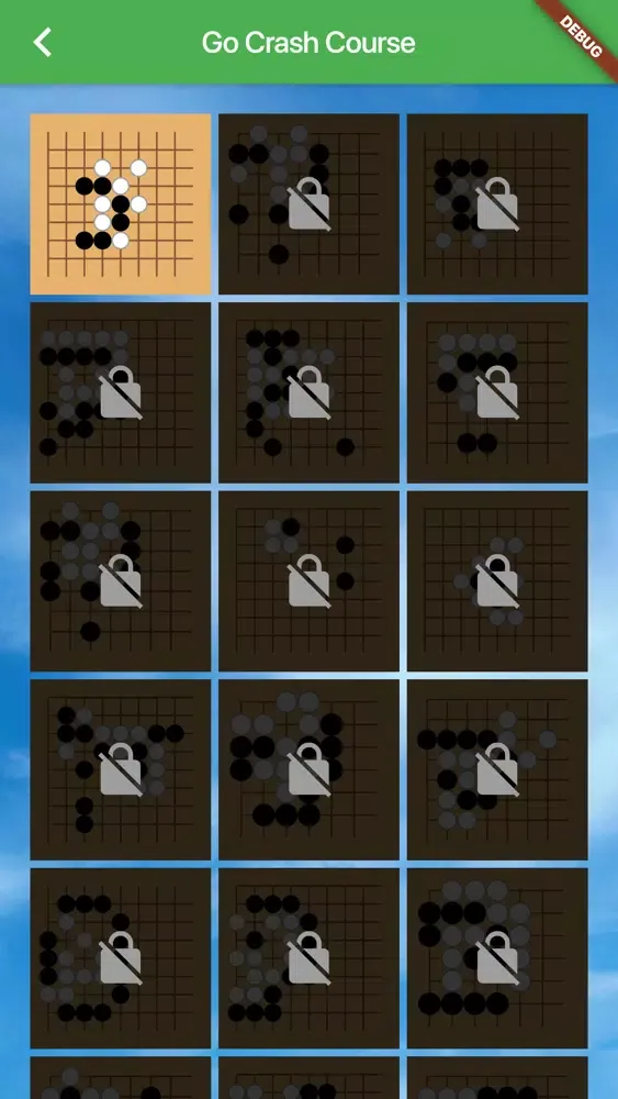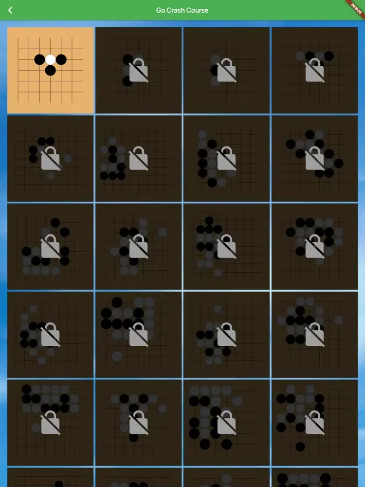 More than 20,000 Go questions, includingBasic Capture,Capture Direction,Capture,Escape,Escape Direction,Capturing Race,Connect,Cut,Ladder,Capturing by Atari,Capturing by Surround,Double Atari,Wedge Atari,Connect and Die,Net,Snapback,Throw-in Atari,Live,Nakade,Seki,Three Stones,Bent Four in The Corner,Five Stones,Six Stones,Symmetrical Position,Eye Kills No Eye,Squeeze,Opponent's Eye,Oshitsubushi,Double Shortage of Liberties,Throw in,Diagonal,Pincer,Tiger's Mouth,Hane,Wedge,Atekomi,Cut,Geta,Bridge Under,Sagari,Placement,Jump,Under the Stones,Sekito Shibori,Attack,Blind Spot,Crane's Nest,Shaping,Tripod Group,J Group,Carpenter's Square,Shape,Life and Death,Tesuji ,Composite Training.