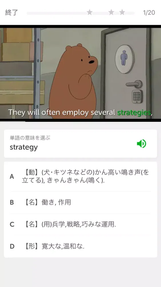 お気に入った単語を登録できるブックマークがしっかりと備わっています、また、お気に入った単語またはその単語の日本語訳を覚えているのかを自分でチェックすることができます