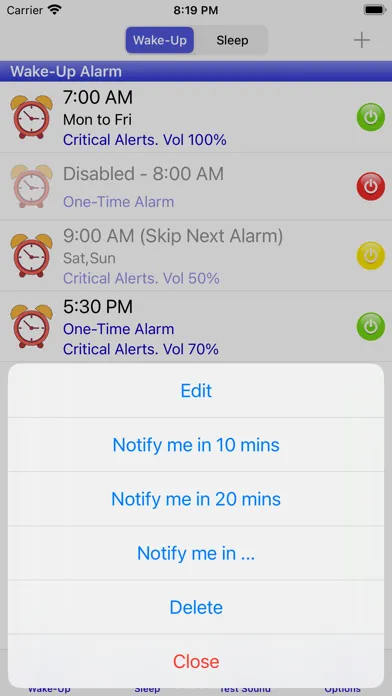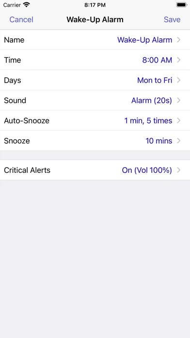 • Auto-Snooze: Automatically repeat the alarm up to 5 times at regular intervals (e.g. 1 min, 5 mins, 10 mins) until you take action
