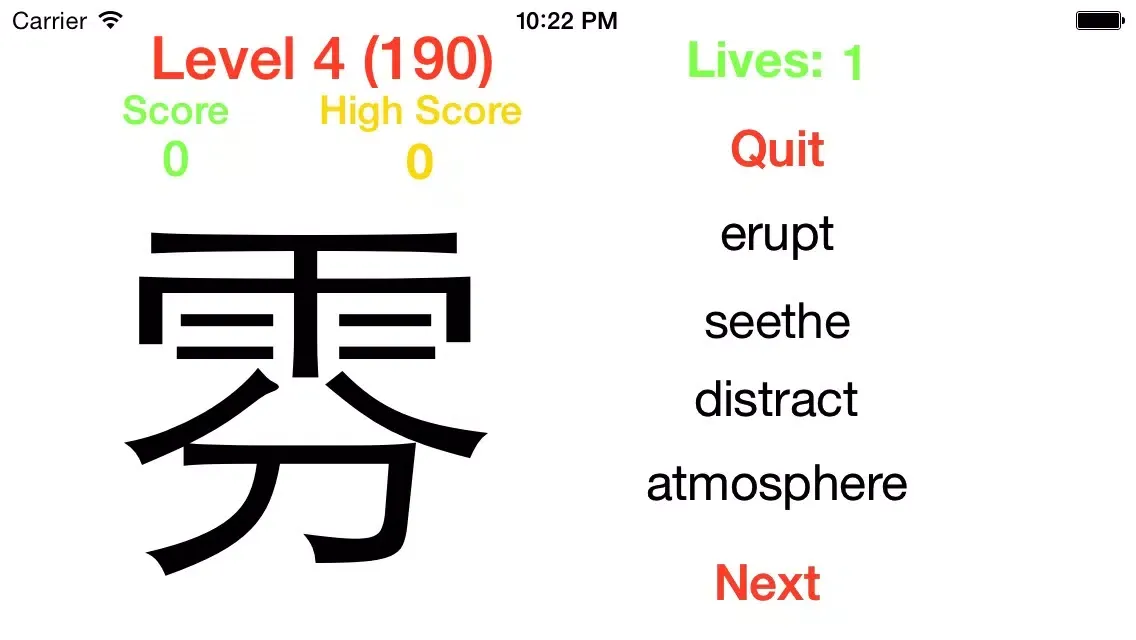 Game app questionnaire to select the correct English word for the Kanji.