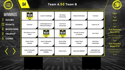 Real-time football has collided with the excitement of bingo with Big Play Blitz! Select the real- time plays on your bingo game board during the live game and grab your opportunity to win big! Again and again! Special Big Plays and Booster Bonus Plays also occur during each quarter for you to add even more points to your score. Just daub the plays on your bingo game card and rack up the points. Follow your favorite team to compete for points and prizes against players from around the world...and right next door. Don't just watch the game...win for yourself!