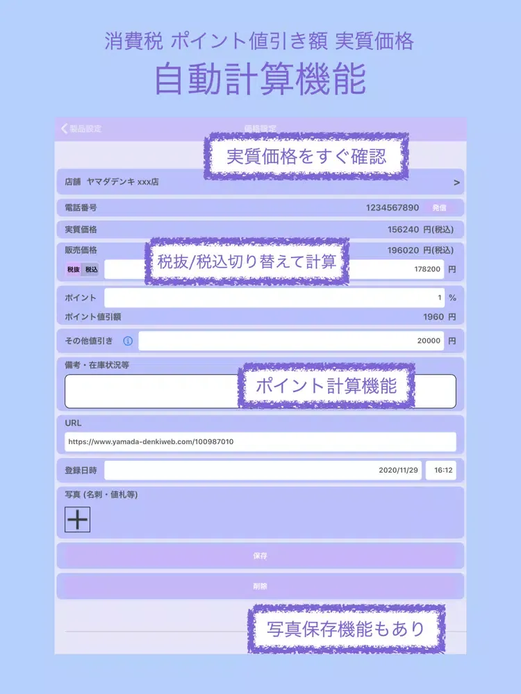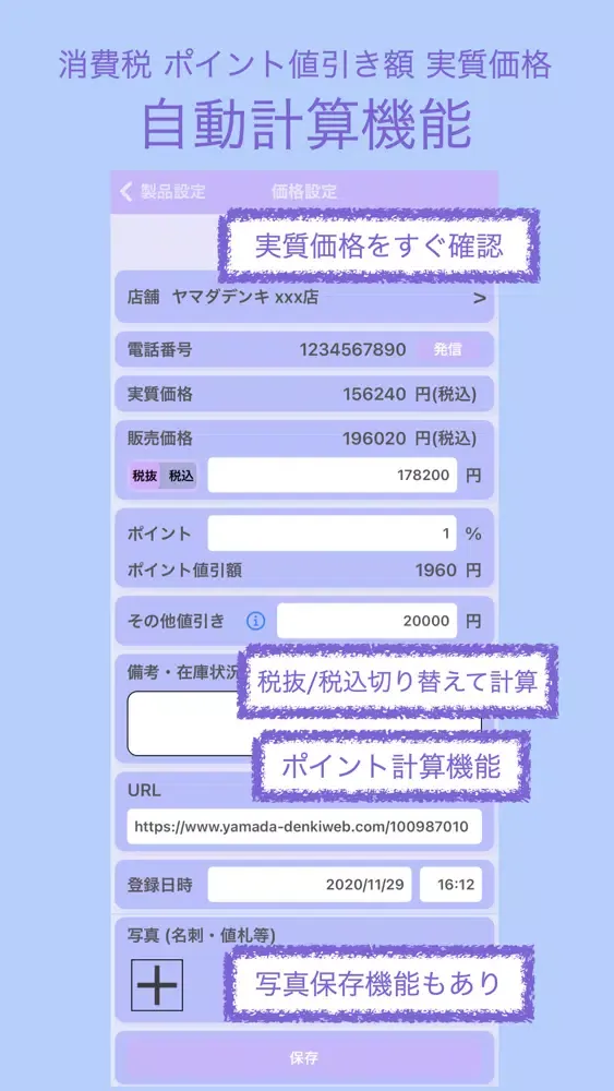 店員さんの名刺や、値札の写真、製品の写真等を保存しておくことが可能です。