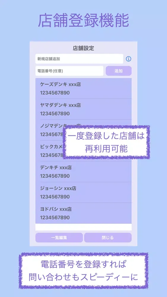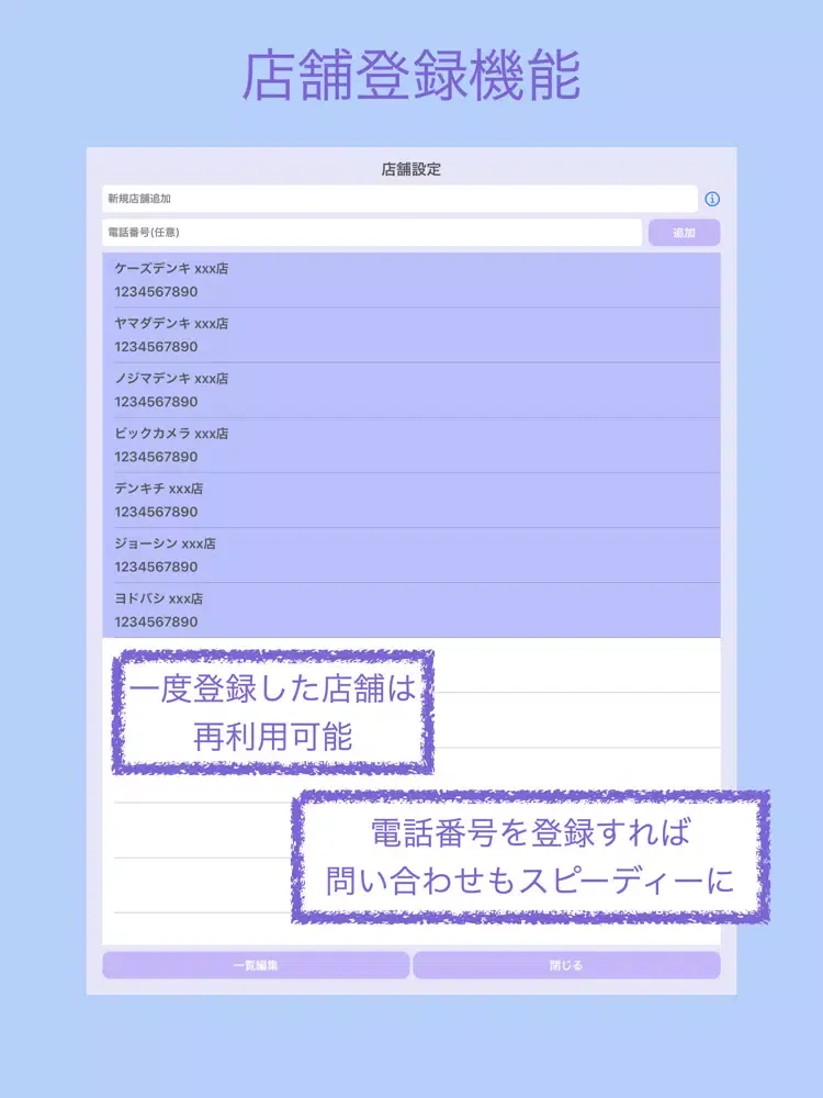 在庫の問い合わせ等、店舗に直接電話したい場合に電話番号を登録しておけば発信して問い合わせることができます。