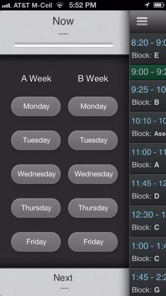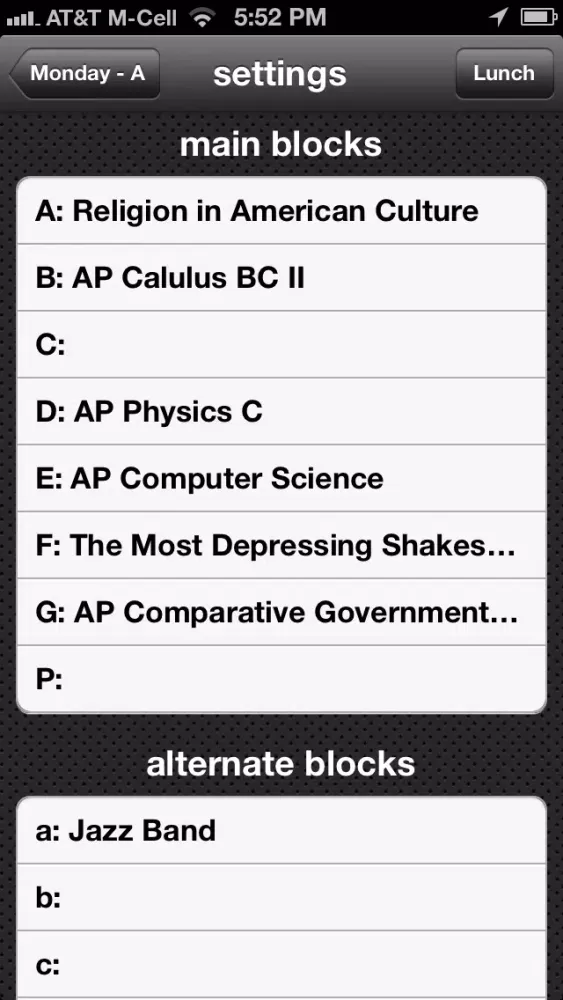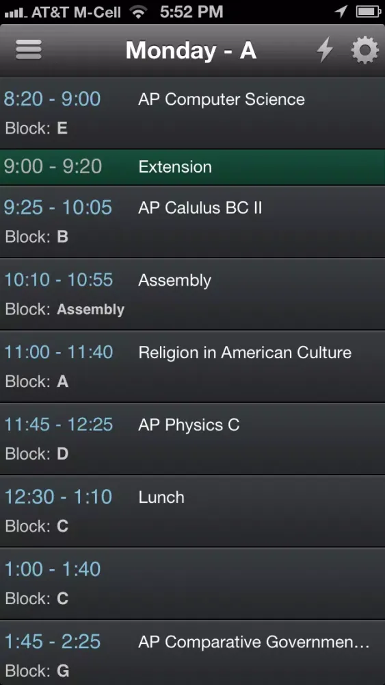 The FASchedule App is here to help you keep track of your day. All you have to do is specify which class you have for each block and which lunch period you have for each day, and then the app instantly generates your schedule for each day of the 2 week schedule. It also is able to detect the current time, and presents you with your current class, and what you have next.