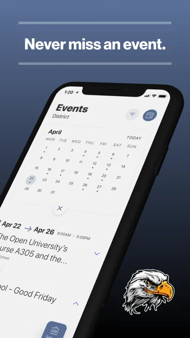 The event section shows a list of events throughout the district. Users can add an event to their calendar to share the event with friends and family with one tap.
