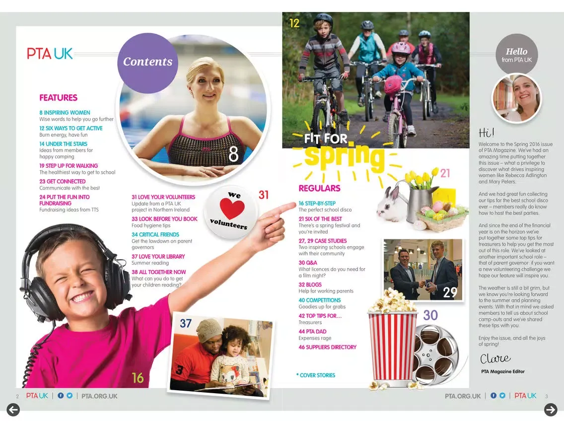 "It gives PTA-UK great pleasure to publish PTA Magazine; it brings together our expertise and experience to provide support for all the thousands of hardworking PTA volunteers in an accessible and easy to read format. PTA Magazine gives a platform to showcase the work and success of PTAs, to harness their experience to support each other and gain endorsements from a range of high profile celebrities”, Jane Galbraith, PTA-UK Membership Development Manager.