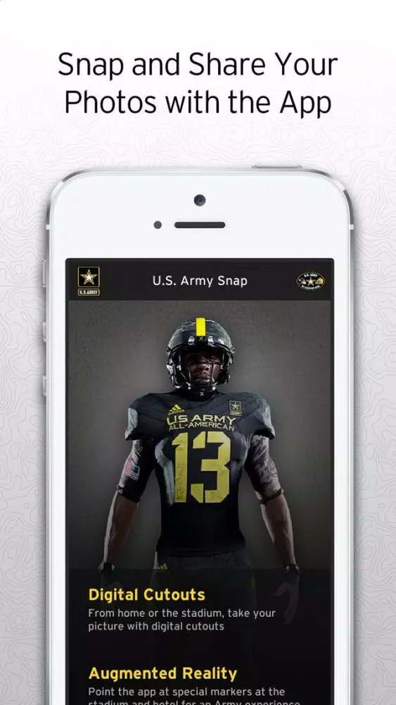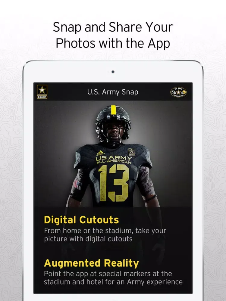 U.S. Army Snap is a fun, immersive app that lets you experience the U.S. Army All American Bowl like never before. Snap your picture with 3D Soldiers, virtually hold the Ken Hall Trophy, and take a selfie wearing Army dress blues. You can even use the app in conjunction with your hotel key to get a special welcome message!