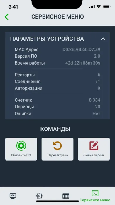 - Кроме того, приложение обеспечивает базовые функции для каждого датчика, включая возможность перезагрузки, смены пароля и обновления программного обеспечения.