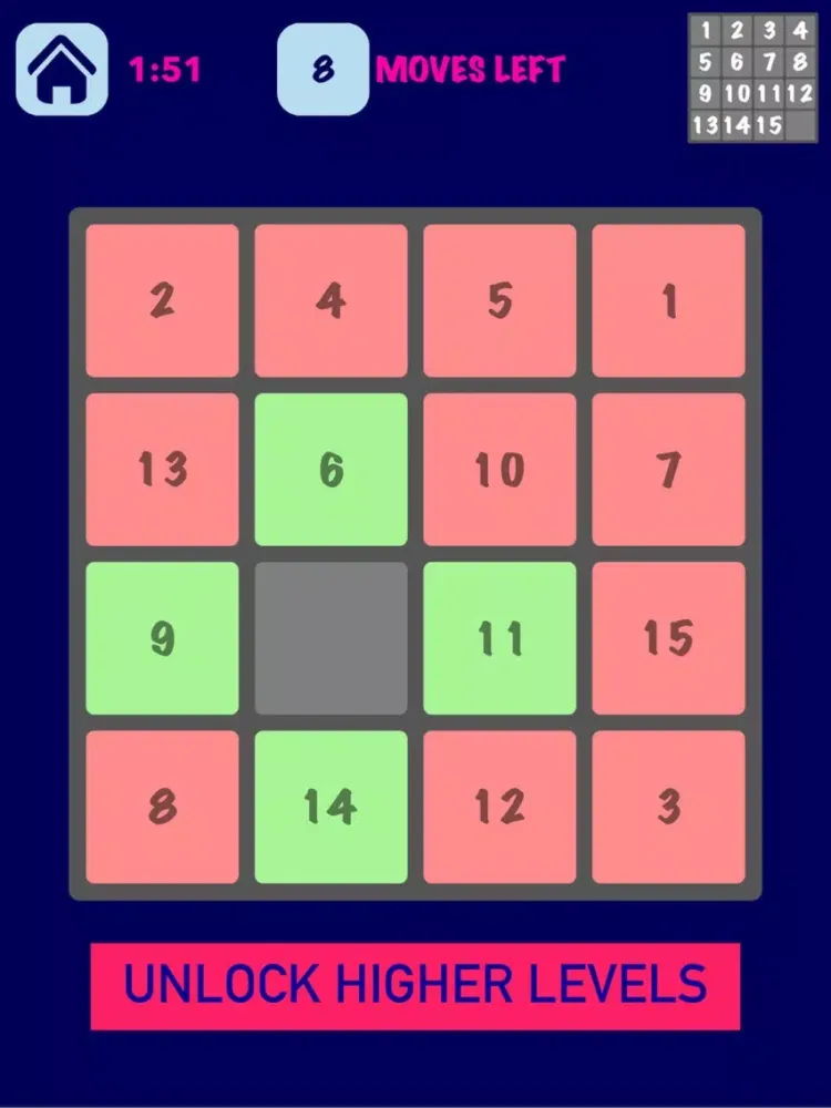 You will start with a 2x2 tiles puzzle and if you solve the puzzle quick enough and with minimal moves and reach the level threshold score then the next level will be unlocked.