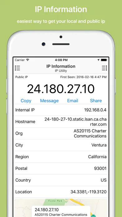 IP Utility is designed to easily find your public IP and internal IP address on your iOS devices and easily share your IP address infomation via Message, Email and many more ways. With the seamless integration with iOS Notification Center Widget, you can quickly find the public IP and internal IP address without opening the app. With the integration of iCloud storage, you can easily find if the public IP is a new IP cross all your iOS devices using the same iCloud account.