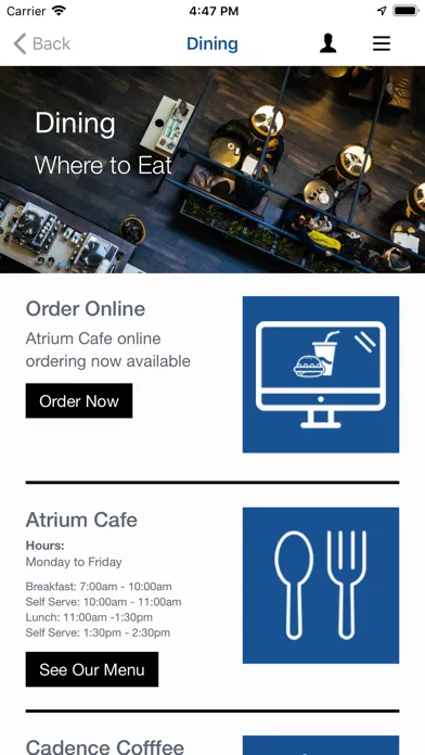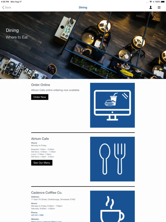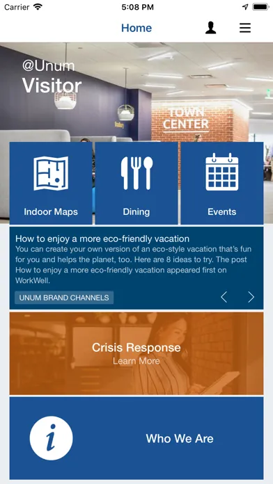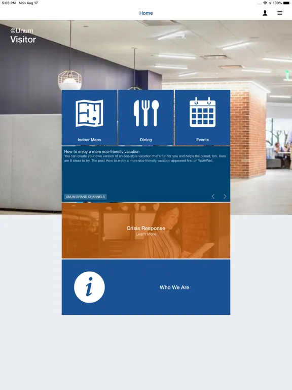 @Unum provides a seamless user experience, coupling work priorities with employee and guest resources. This mobile-friendly platform allows employees and visitors to explore campus maps and read important news from the palm of their hand. Further capabilities include push notifications, meeting room maps, online food ordering, and desk reservations.