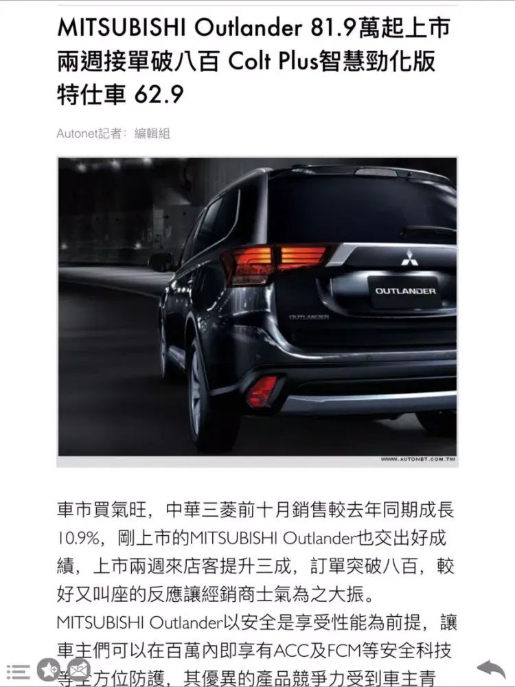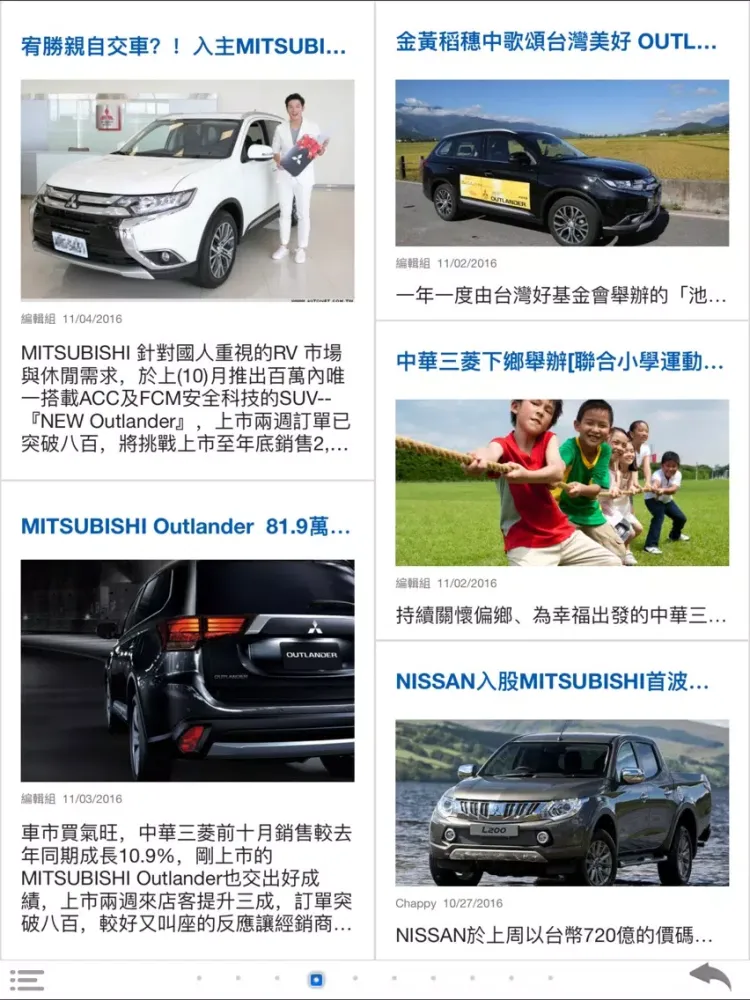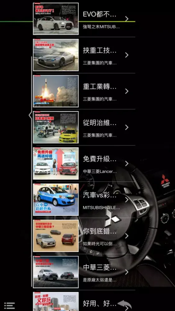 秉持著提供車迷更多元且即時的訊息,推出探索MITSUBISHI App,不定時更新第一手最熱門有關MITSUBISHI汽車品牌的相關訊息與新聞,讓喜愛的MITSUBISHI品牌的車迷朋友能夠掌握任何的最新動向,不只方便瀏覽,更可建立個人書籤,並透過MAIL即時分享給同好、好友。結合智慧型手持裝置的便利優勢,結合影音、導航、電子書等豐富功能,提供據點查詢、車款型錄、專題報導等品牌相關資訊,滿足車迷們對於MITSUBISHI品牌所有知性的需求。