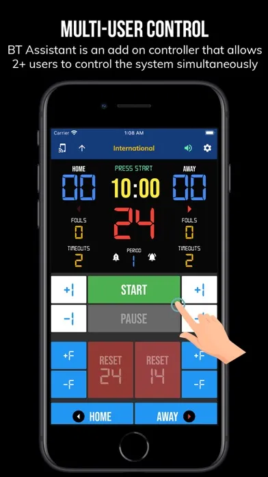 The interface is exactly the same as the main BT Controller. The interface is extremely clean and intuitive, everything is directly touch or swipe based. Clearly labeled controller buttons are also added for those that prefer a button interface. Thoroughly tested in our basketball leagues, the BT Assistant app is easy to learn and new assistants can be helping to run the time and score for a basketball game in no time.